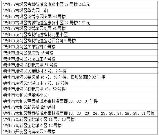 为进一步有效阻断疫情传播风险,切实保障广大市民生命安全和身体健康,根据当前疫情防控工作需要,按照《新型冠状病毒肺炎防控方案(第九版)》相关规定,经综合研判,2022年11月10日12时起,将锦州市主城区22个中风险区域调低风险(具体名单见下表)。
