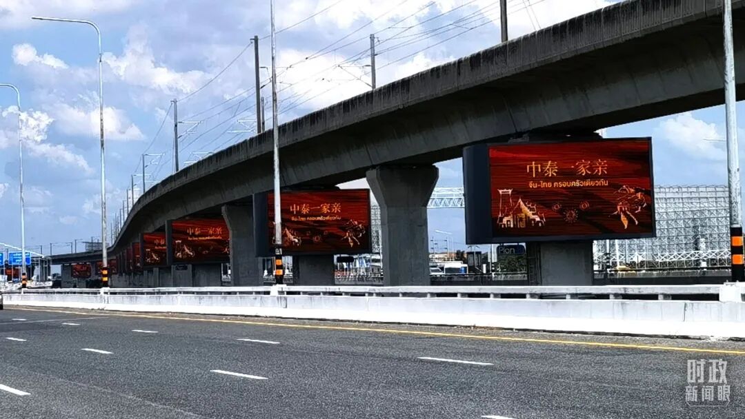 △曼谷街道,巨幅电子屏用中泰文字写着“中泰一家亲”。(总台央视记者马超拍摄)