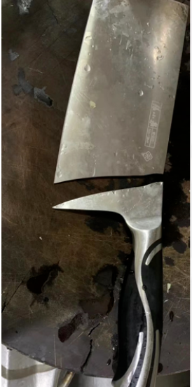 重庆某钢铁公司质检中心技师郑师傅表示:“硬度较高材质的刀具比较脆,横拍时刀具不能变形就会发生断裂。厂家为了保证刀具的锋利度,要使淬火钢的硬度达到一定要求,刀刃硬度越高越锋利。刀具横拍断裂,是因为刀面受力后,受力面积大幅度变大,刀面承受的压强变大,硬度较高的刀具无法跟随变形,于是发生断裂。”