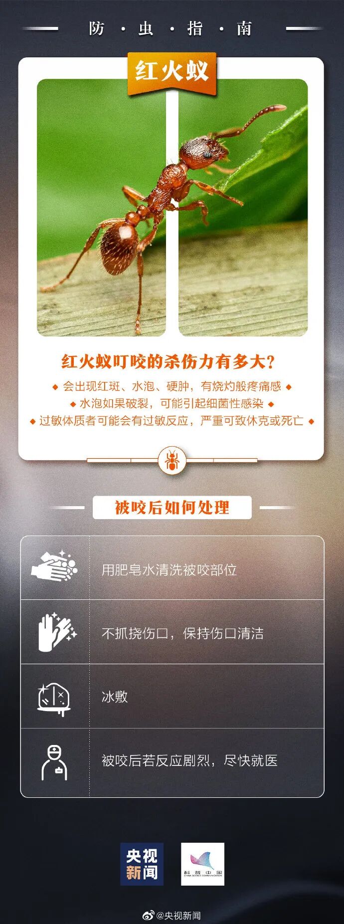长沙市动植物疫病预防控制中心检疫科科长薛爽表示:“红火蚁的食谱很广,在农田内会啃食经济作物,对农业生产造成影响。红火蚁最开始起源地在南美,跟随货轮、货物运输传过来的,它攻击力极强,如果贸然去破坏它的巢穴,很可能会遭到它的反击,这个蚂蚁是带毒的。”据悉,人体被红火蚁叮咬后,会出现像火烧灼般的疼痛感,随后会出现如灼伤般的水泡,少数人对毒液中的毒蛋白过敏,会发生过敏性休克,有生命危险。