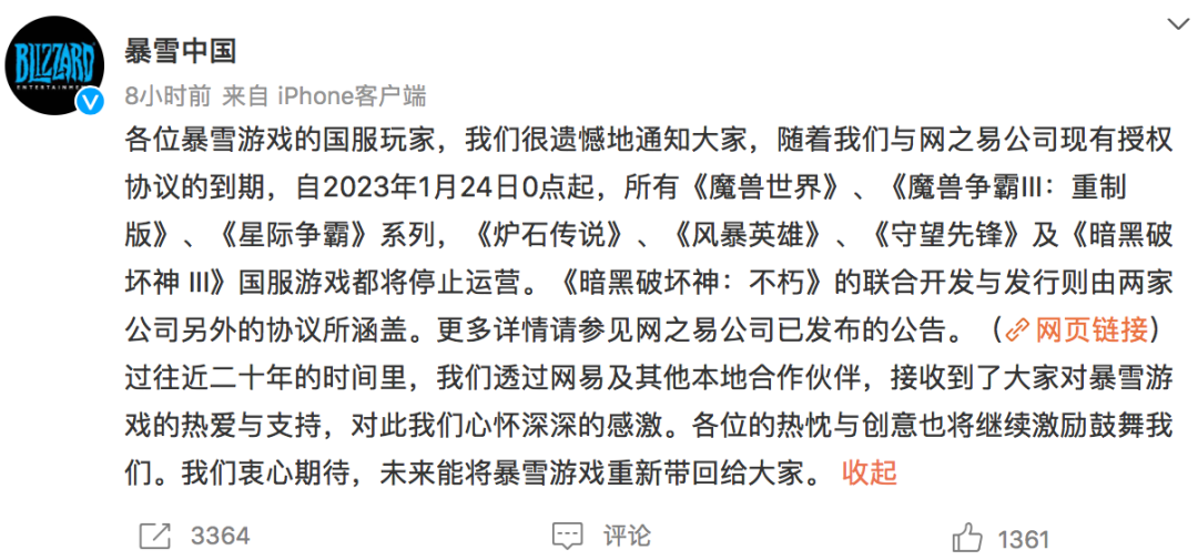 11月17日上午,就在网易即将发布2022年第三季度财报之际,曾合作14年的商业伙伴动视暴雪(以下简称“暴雪”)发布声明称,与网易的合作于2023年1月到期且不再续约,将暂停在中国大陆的大部分暴雪游戏服务,《魔兽世界》《炉石传说》《守望先锋》《星际争霸》《魔兽争霸III:重制版》《暗黑破坏神III》和《风暴英雄》均将于2023年1月24日0点起正式停服。![]()