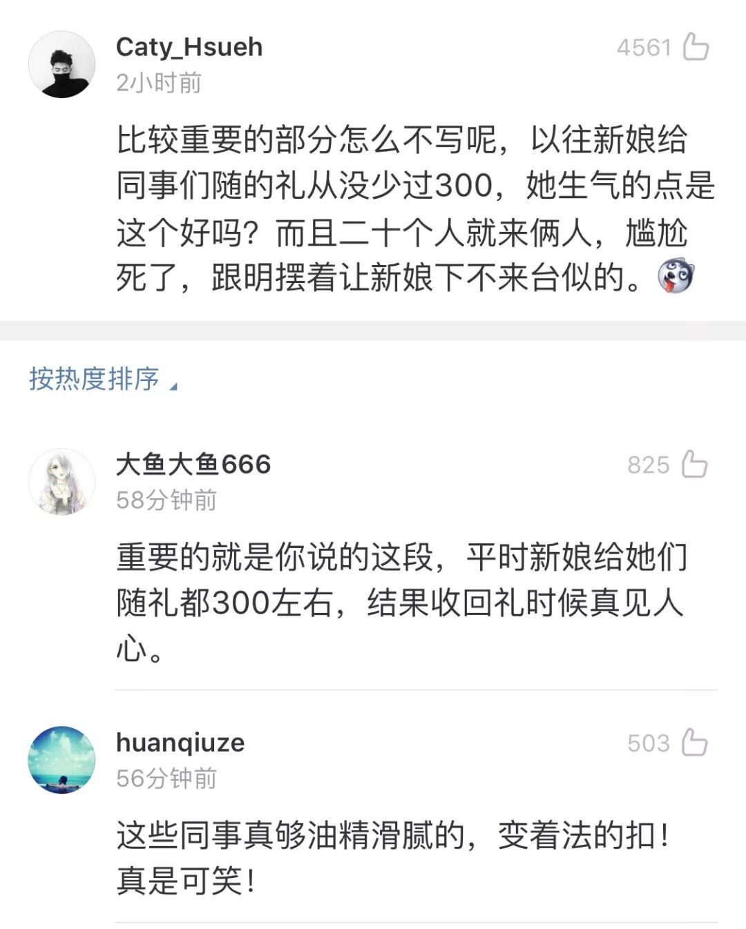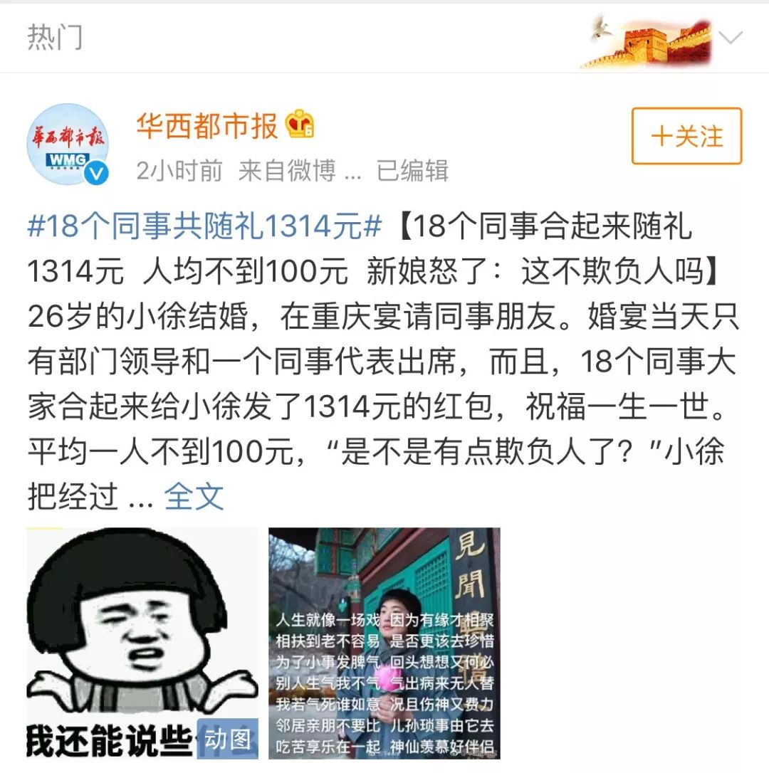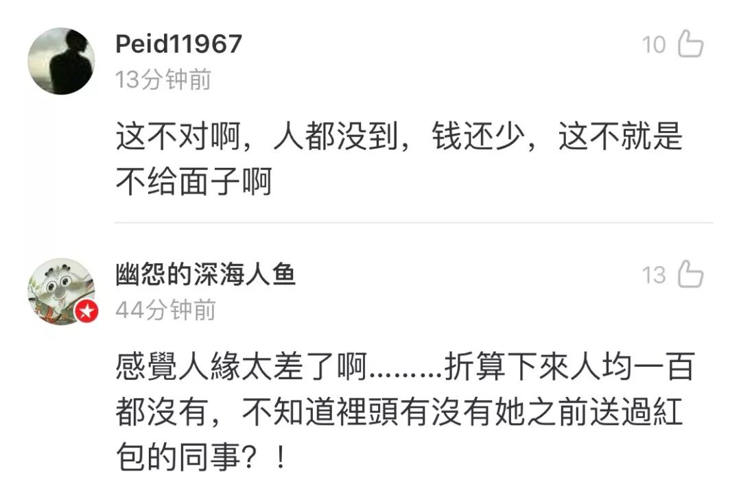 小徐又把这件事情发到贴吧里,马上引起了网友们的讨论。有些人觉得小徐的同事们太不厚道;也有人觉得结婚就是图个大家的祝福,小徐太看重对方的随礼,所以才会因此生气。