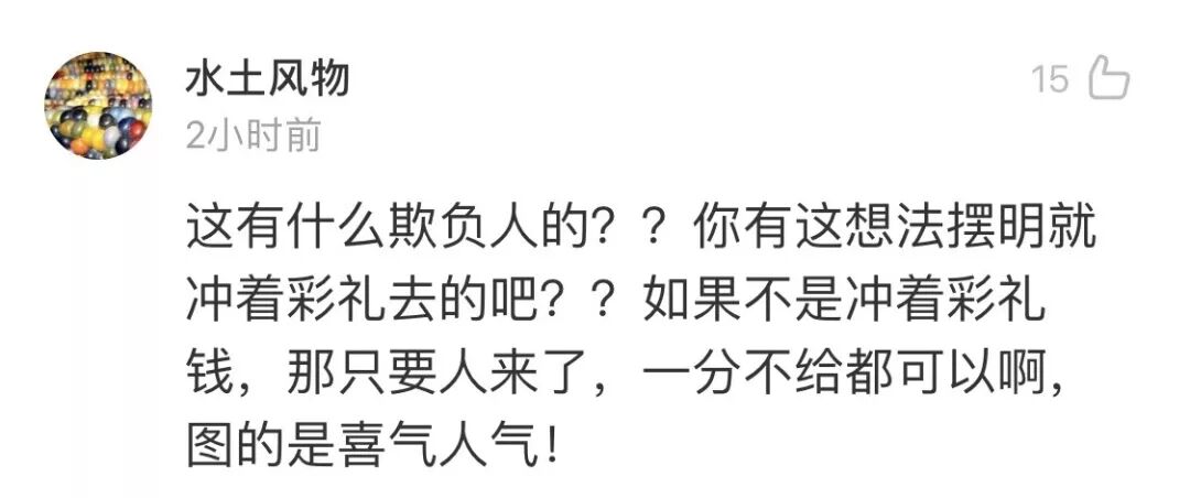 还有小部分网友觉得,婚礼应该看重情谊,礼轻情意重,不要只看钱,那样会让婚礼变了味道↓↓