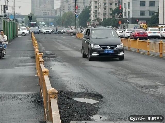 这段时间杭州连续雨天,导致沥青出现坑洞,“这段路上的坑相对较多,你看那边铺的铁板,下边也是坑。这几个坑有些深,也比较明显,但是再铺铁板,会有很大的噪声。这里总共就两个车道,放警示牌会影响通行。所以,现在我们采取的措施,就是用沙袋填平,再铺上沥青。不过车子碾过之后,袋子一破掉,车来车往,坑还会露出来,我们这几天都在不停地修。目前的话,有大修的计划,但是要等到雨停之后,才能施工。”