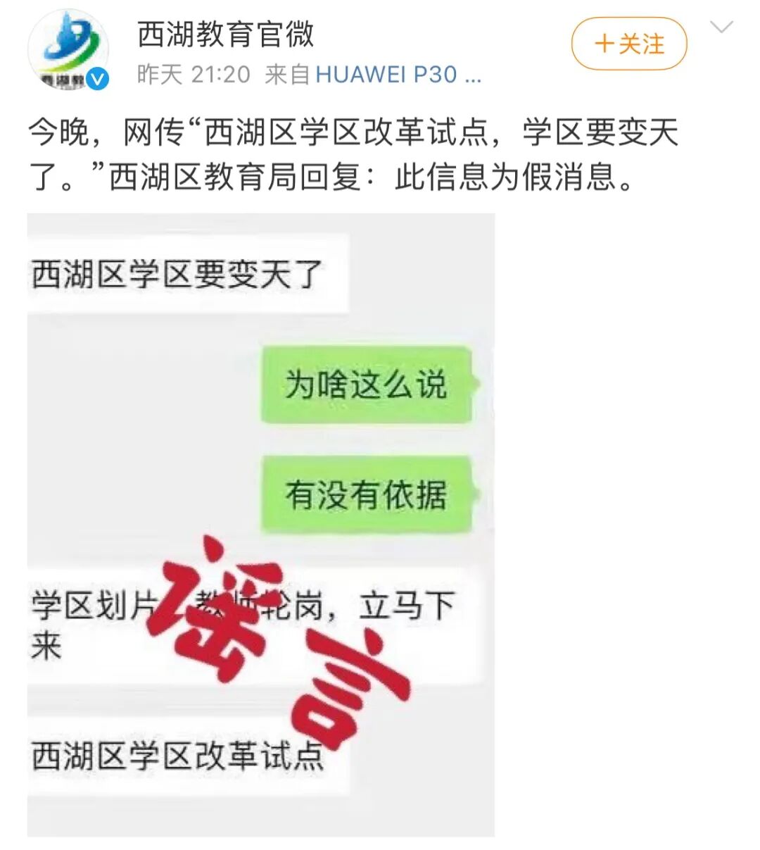 近日,网上突然传出杭州西湖区将进行学区改革试点,实行多校划片和教师轮岗,学区房要变天了。一时间消息传得沸沸扬扬,家长们都为此感到紧张。不过好在西湖区教育局很快就在官方微博发布了辟谣信息,称上述学区改革的消息是假的。