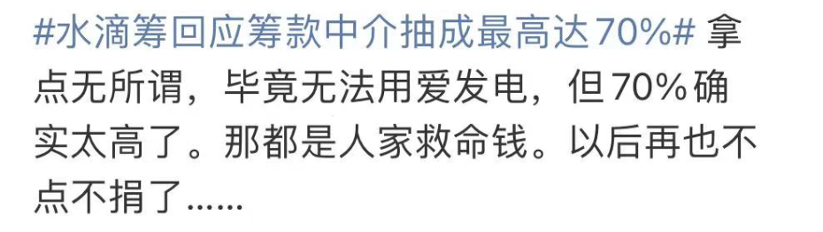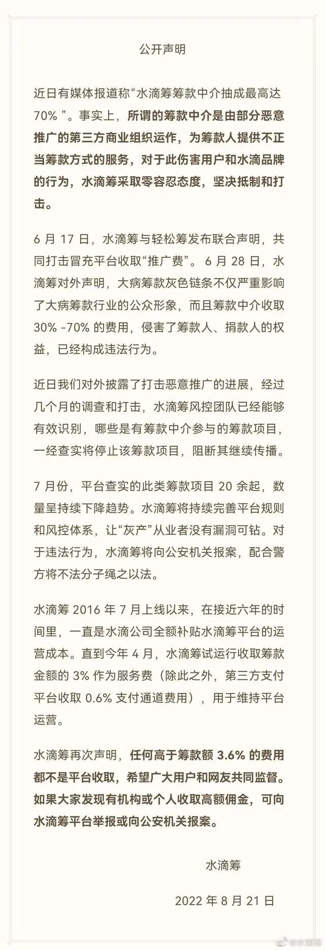水滴筹CEO沈鹏转发了该声明,并表示,所谓的筹款中介是由部分恶意推广的第三方商业组织运作,非水滴筹行为,对于此类行为,水滴筹采取零容忍态度,坚决抵制和打击。