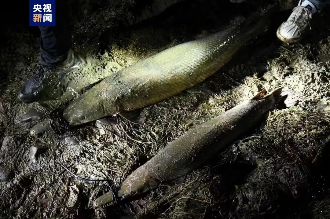 8月25日,广西桂平市农业农村局在西山风景区莲池内成功捕获2条鳄雀鳝(均长约1米,重约7.5公斤)。微信公众号“新桂平” 图