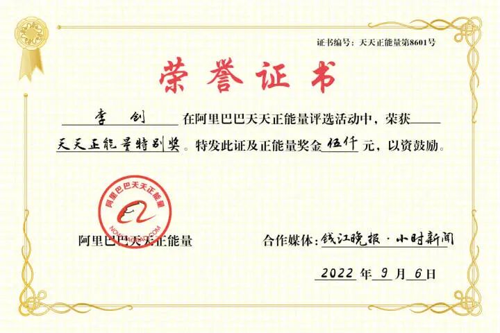 阿里巴巴天天正能量看到钱江晚报小时新闻的报道后,也被李创的奋不顾身所打动。经申报后决定,授予李创阿里巴巴天天正能量特别奖,颁发正能量奖状及5000元奖金。