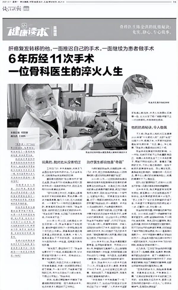 “之前有一次他在卫生间里滑倒,断了三根肋骨,第二天却照样若无其事地出诊、手术。还有一次,他硬生生推掉自己的手术去给患者做手术。这几年,医院领导不知几次‘命令’他,让他一定休息好,但他心里装满了病人,爱护病人远远大过爱自己。”