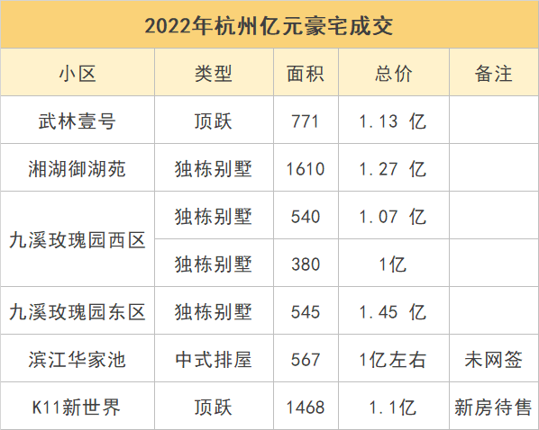 有豪宅经纪人整理了一份今年杭州亿元豪宅成交表格。表格中显示,截至目前已经有5套亿元豪宅成交,除了这套九溪玫瑰园小楼王,还有湘湖壹号别墅、武林壹号顶跃,以及九溪玫瑰园西区两套独栋别墅。这两套九溪玫瑰园别墅分别是:建筑面积380㎡的房源以1亿元成交,折合单价约26.32万元;建筑面积540㎡的房源以1.07亿元成交,折合单价约19.81万元。此外,今年“双十一”当天曾有一套九溪玫瑰园别墅在阿里资产平台上拍卖(为房东个人拍卖,非司法拍卖),建筑面积373.83㎡,起拍价7500万元。当时虽有1人报名,但未出价,房子流拍。不过随后没多久,这套房子通过线下中介带看,在二手房市场成交,据悉成交价格为7000万元,折合单价约18.73万元。今年6月2日,透明售房网上有一套九溪玫瑰园签约,一套409.36㎡的别墅,以9000万元成交,折合单价约21.99万元。事实上,前两年在杭州顶级豪宅市场非常红火、相继创下成交单价最贵纪录的次新房江南里、云栖玫瑰园,今年几乎没有成交,反而是交付多年的老牌豪宅九溪玫瑰园一枝独秀。对此,豪宅经纪人们认为,九溪玫瑰园背枕五云山,面眺钱塘江,靠山面江,地理位置得天独厚,加上房子内部改造空间比较大,这些独特优势让富豪们很是青睐。“不少客户在多个顶豪小区都有房产,对他们来说,收藏稀缺好房,也是一种穿越经济周期的资产保值增值方式。”