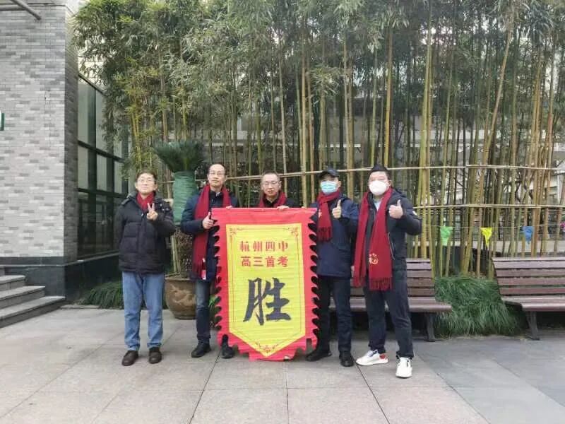 杭州第四中学下沙校区,老师们手拿旌旗,给同学们送考,祝大家首考胜利。今年的送考,大家更多地选择了隔空加油。
