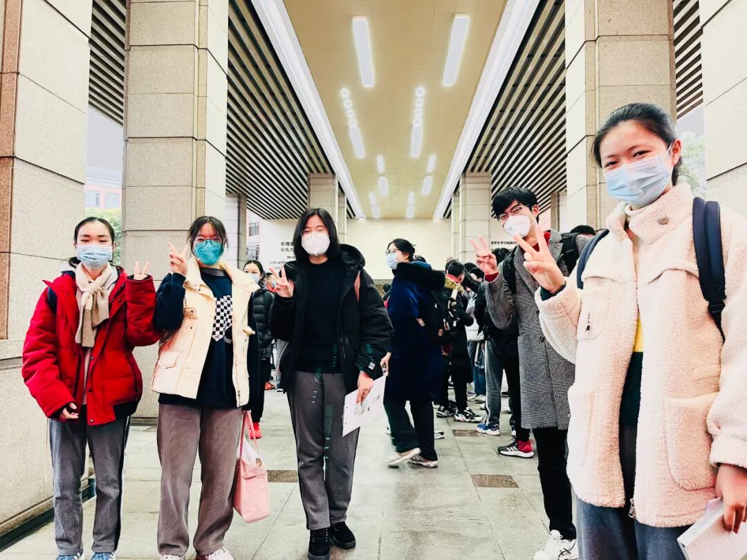 杭州第二中学滨江校区,考生们比着胜利的手势步入考场,口罩也挡不住他们自信的表情: