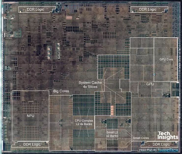 A12的主要性能模块均位于芯片的右方和下方,其中最右侧是占地面积最大的GPU集群,4颗核心2*2对称排列,将一小块公用电路夹在中间。左侧紧挨着GPU集群中腰的是CPU和GPU的共享缓存(L3缓存),下方是低功耗CPU核心集群,左方是的高性能CPU核心集群,最左边则是8核NPU。