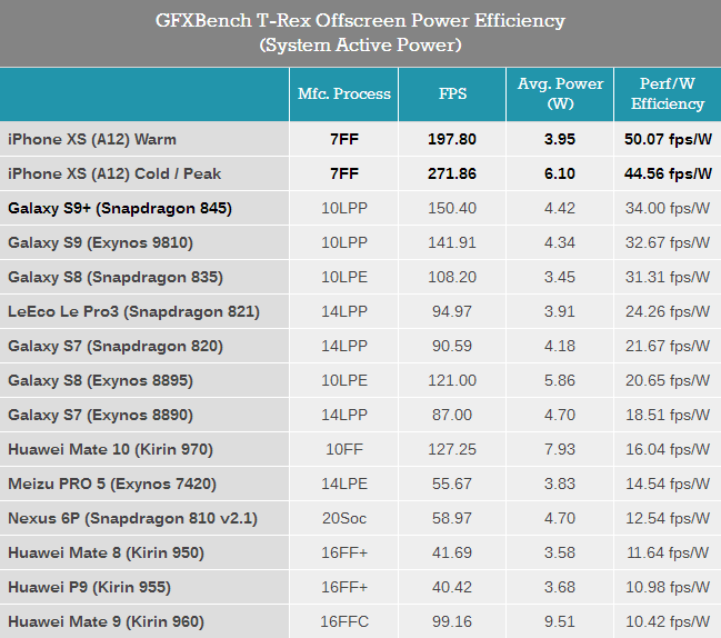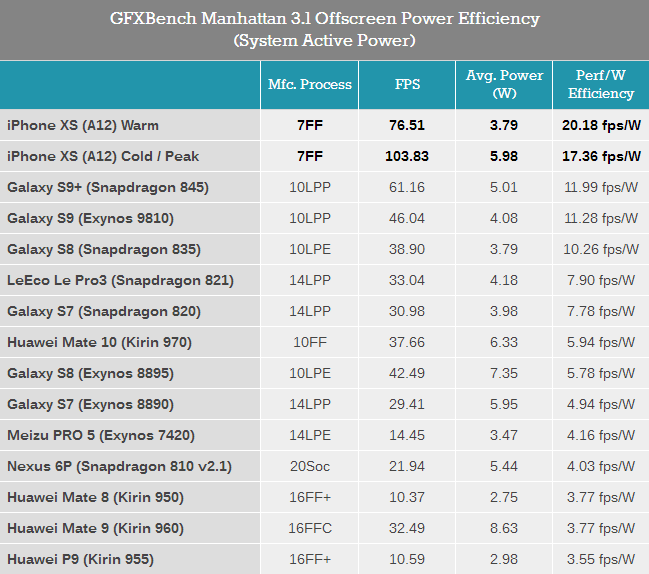 在环境温度22°C时,A12测试曼哈顿3.1时的峰值功耗达到6瓦。但即使在这样的峰值功耗下,A12的效率也超过了所有其他SoC,说明苹果对功耗的控制是非常有效的。在运行测试3分钟后功率回落至合理的3.79瓦,而此时处理器的能耗比仅相较峰值功耗时提升了16%,证明A12的能耗比曲线非常平坦,6瓦的峰值功耗仍在芯片本身的可控范围之内,足见苹果在芯片设计上的功力之强大。