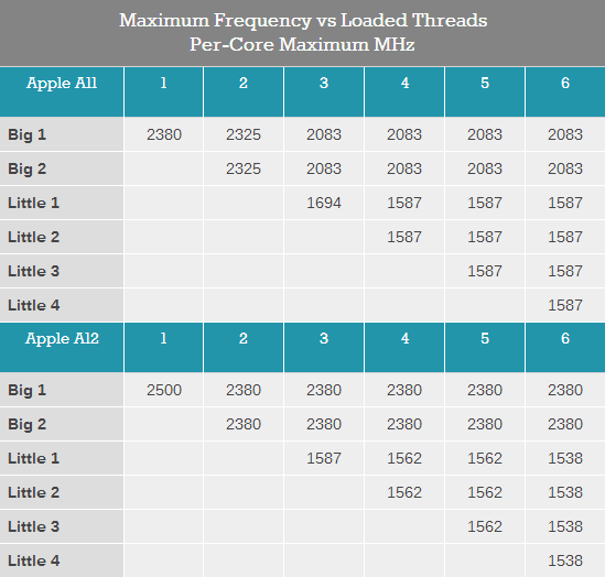 A11和A12在单大核心满载时的最高频率分别为2380MHz和2500MHz;双大核心满载频率分别为2325MHz和2380MHz。而在小核心加入工作后,A12的大核心频率仍被设计为稳定在2380MHz,而A11则会进一步下调至2083MHz。