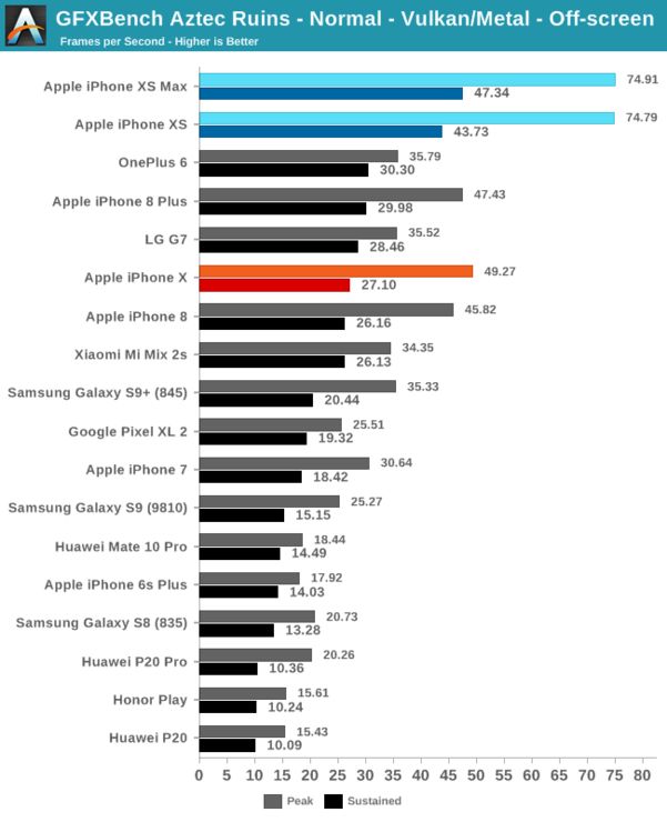 在曼哈顿3.1中, iPhone XS的性能比iPhone X高出75%。这里的改进不仅要归功于增加的核心,还有显存压缩技术降低RAM功耗的功劳。