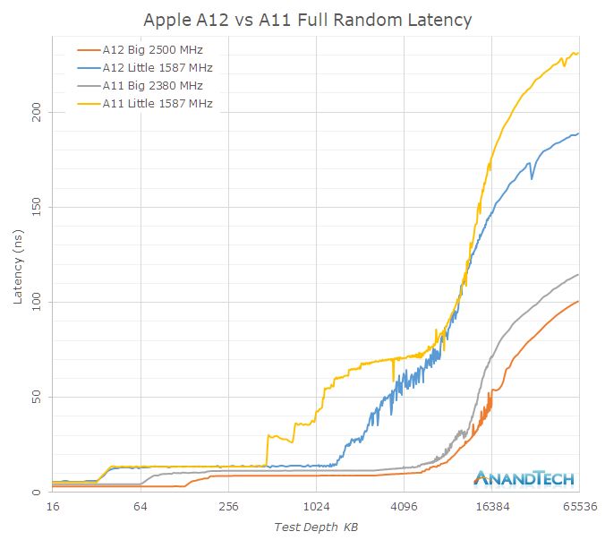 正如之前所提到的,苹果在A12的缓存结构和内存子系统上投入了大量的工作。回到线性延迟图上,我们看到以下针对大核和小核的完全随机延迟的行为: