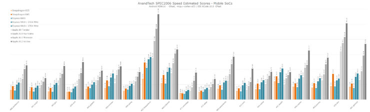 其中增幅最小的是456.hmmer和464.h264ref这两项测试,这也是SPECint2006套件中成为瓶颈最多的测试。由于A12架构方面似乎没有真正的重大变化,小幅增长主要归功于更高的频率以及缓存结构的改进。
