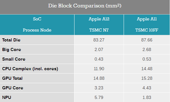 纵观A11和A12中不同模块的面积变化,可以清晰的看到台积电全新7nm制程的优势。鉴于几乎所有的模块架构都有了变化,无法计算出7nm制程的晶体管密度有多大提升,不过若以单个GPU核心作为参考,在A12中相比A11中的面积减小了37%。