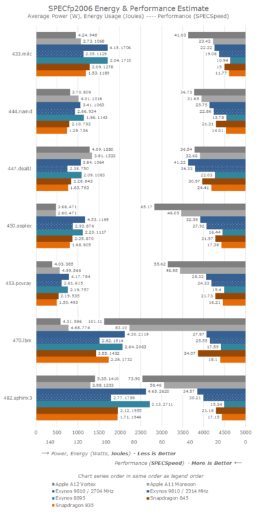 与SPECint测试类似,A12在SPECfp测试中的能耗比有明显提升,在所有测试中总能量比A11低10%。另一方面A12的功耗也有所增加,平均功耗从3.65瓦上升至4.27瓦,其中433.milc项目的功耗从2.7瓦增至4.2瓦,增加了75%;482.sphinx3项目的功耗则达到了A12所有SPEC测试项中的最大值5.35瓦。