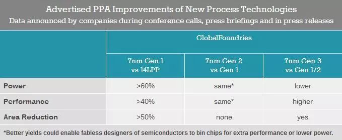 相比之前的14nm LPP制程,7LP制程在功率和晶体管数量相同的前提下,可以带来40%的效率提升,或者在频率和复杂性相同的情况下,将功耗降低60%。但受限于四重光刻这一复杂流程,GF表示根据不同应用场景,7LP只能将芯片功耗降低30~45%。