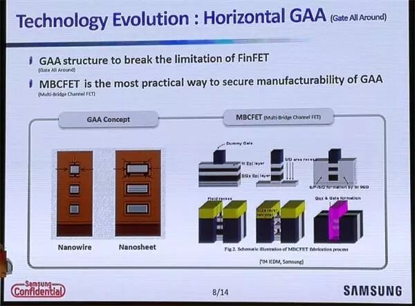 根据三星在CSTIC大会的报告,GAAFET(Gate All Around)是7nm制程节点上最好的选择。GAAFET是一个周边环绕着gate的FinFET,和目前垂直使用fin的FinFET不同,GAAFET的fin设计在旁边,能够提供比普通FinFET更好的电路特性。