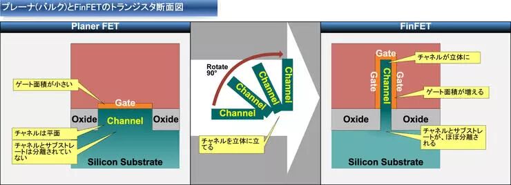 有趣的是,本来FinFET就是将原来的Planer型晶体管90度“放倒”而成。Planer型晶体管是在平面内生成,在其上面紧接着生成栅极(gate)。