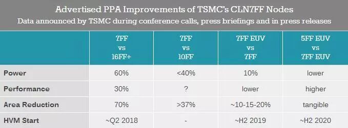 在接下来的第二代7nm FinFET+制程上,台积电将开始使用EUV光刻。针对EUV优化的布线密度可带来约10~20%的面积减少,或在电路复杂度相同的情况下,相比7nm FinFET再降低10%的功耗。