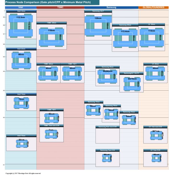 而根据後藤弘茂的分析,如果将Intel、台积电、三星和GF近些年制程的特征尺寸放在一起对比,也可以看出Intel的14nm制程确实要优于三星和GF的14nm LPP以及台积电的16nm FinFET,仅略输于三星早期的10nm制程。