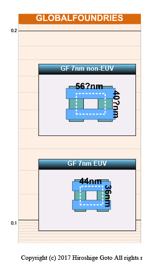 从後藤弘茂分析中可以看到,GF的7nm DUV特征尺寸为56nm*40nm(Gate Pitch*Metal Pitch),应当与台积电7nm DUV的基本相当。而7nm EUV的特征尺寸为44nm*36nm,与三星7nm EUV完全一致(毕竟同源)。