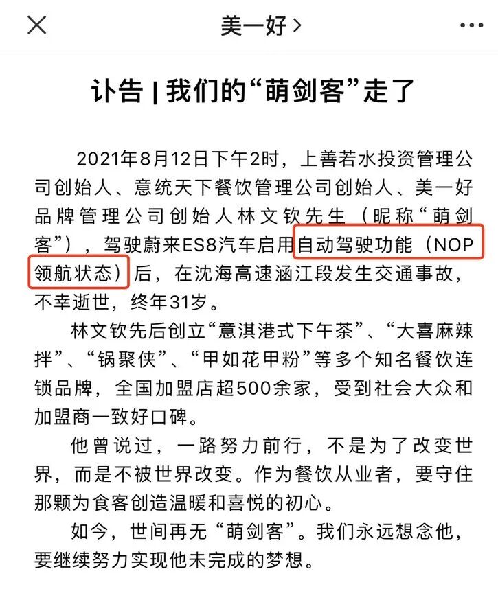 上善若水投资管理公司创始人、意统天下餐饮管理公司创始人、美一好品牌管理公司创始人林文钦(昵称“萌剑客”),驾驶蔚来 ES8 汽车启用自动驾驶功能(NOP 领航状态)后,在沈海高速涵江段发生交通事故,不幸逝世,终 31 岁。