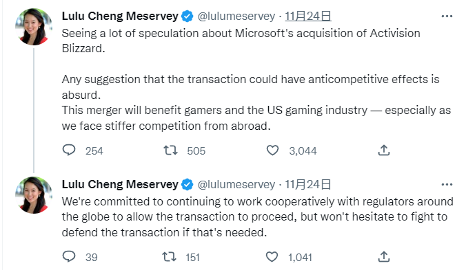 动视暴雪企业事务执行副总裁 Lulu Cheng Meservey 在推特上表示,动视暴雪被微软收购有利于游戏玩家。他们决心捍卫被微软收购的权利,将毫不犹豫地为此次交易而战。她说:「任何关于该交易可能具有违反竞争的说法都是荒谬的,这次合并将使游戏玩家和美国游戏产业受益,尤其是在面临来自国外的更激烈竞争的情况下。」(来源:IT之家)