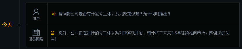游族网络在投资者互动平台表示,公司正在进行的《三体》系列 IP 游戏开发,预计将于未来 3-5 年陆续推向市场。(来源:36 氪)