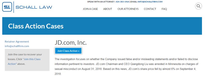 目前,有三家美国的律所(Rosen, Schall和Pomerantz)已经介入此事并准备展开调查,以决定是否代表投资人对京东提起法律诉讼。