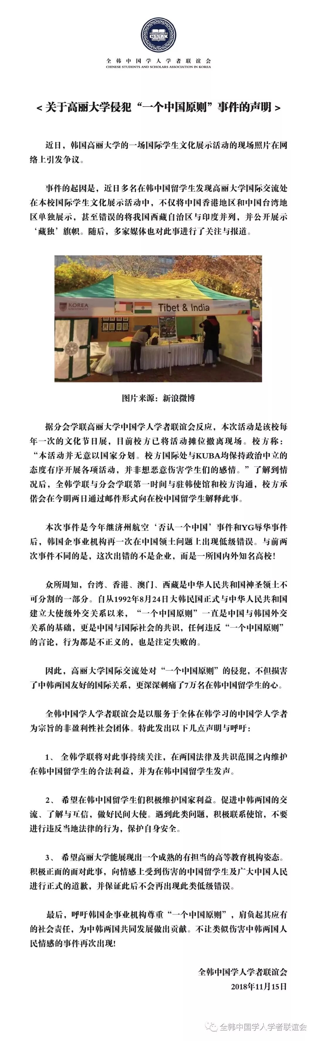 14日,韩国高丽大学首尔校区举办国际学生文化展示活动,因其将“西藏与印度并列”展出,且出现“藏独”旗帜,在中国微博上引发争议。15日,全韩中国学人学者联谊会官方微信发表声明,谴责高丽大学侵犯“一个中国原则”,并联系到此前发生的济州航空否认“一个中国”事件和YG辱华事件,批评韩国知名高校继韩国企业之后又一次在中国领土问题上出现低级错误。