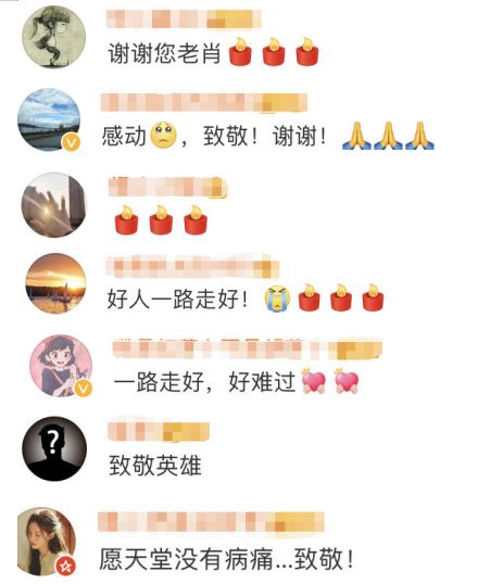 网友纷纷向肖贤友致敬,他们说,“谢谢你,老肖”,“一路走好”。他们还说,“愿天堂里没有病痛”。↓