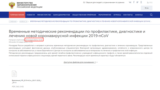 根据这名用户提供的相关信息,环球网记者21日登陆俄卫生部官网,查询了聊天记录中提到的一份1月30日公布的通知:《新冠状病毒感染预防、诊断和治疗临时方法建议》。按照发帖者所说,有关“新冠病毒系人工合成”的消息被发布在文件“首页重要信息第五条”,但经环球网记者查询,并未看到有关“病毒系人工合成”的任何信息。