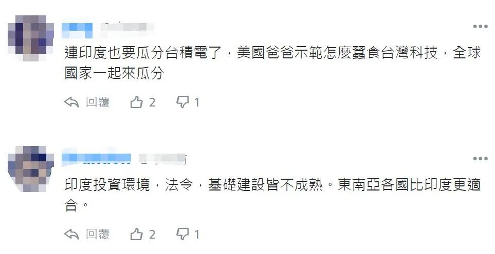 关于印度寻求与台湾企业合作在本土建芯片制造厂的消息,台湾网民也多是唱衰。对于印度人工作态度、印度投资环境、基础设施落后等问题,网民在评论中都有提及,此外对于此前美国欺压台积电的经历,也有网民吐槽印度这是有样学样,也想要蚕食台湾企业的技术。