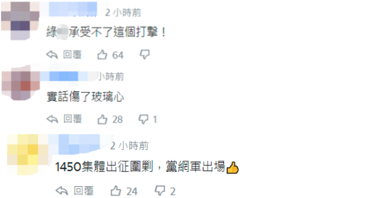 不少网友则讽刺,“绿营承受不了这个打击”、“实话伤了(绿营)玻璃心”、“1450(指绿营网军)集体出征围剿,民进党网军出场”。↓