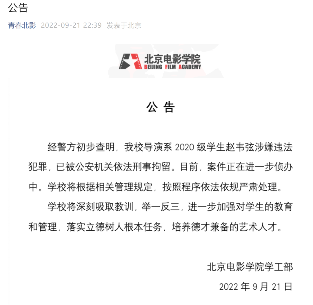 21日晚,北京电影学院通过其官方微信公众号就“学生赵某某被依法刑拘”一事发布公告,全文如下:
