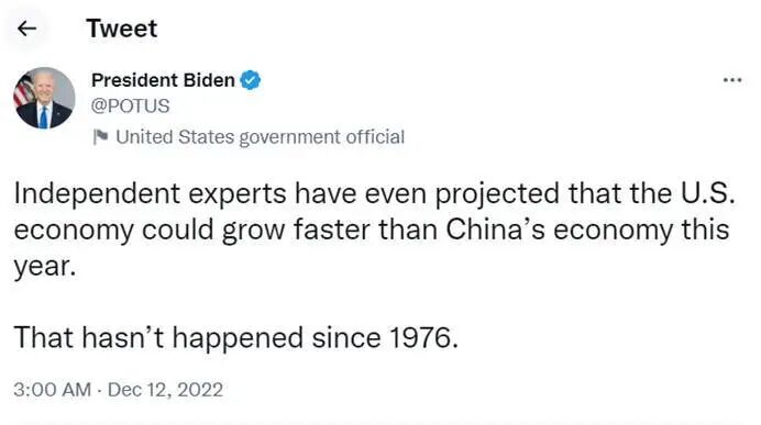 拜登11日发表了一条简短推文,内容是“根据独立专家预测,今年美国经济增速可能超过中国。这是自1976年以来从未发生的情况。”