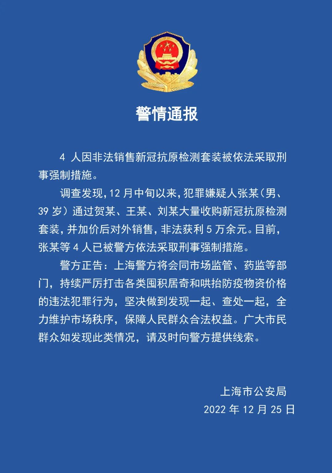 12月25日,“警民直通车上海”微信公号通报:4人因非法销售新冠抗原检测套装被依法采取刑事强制措施。全文如下:
