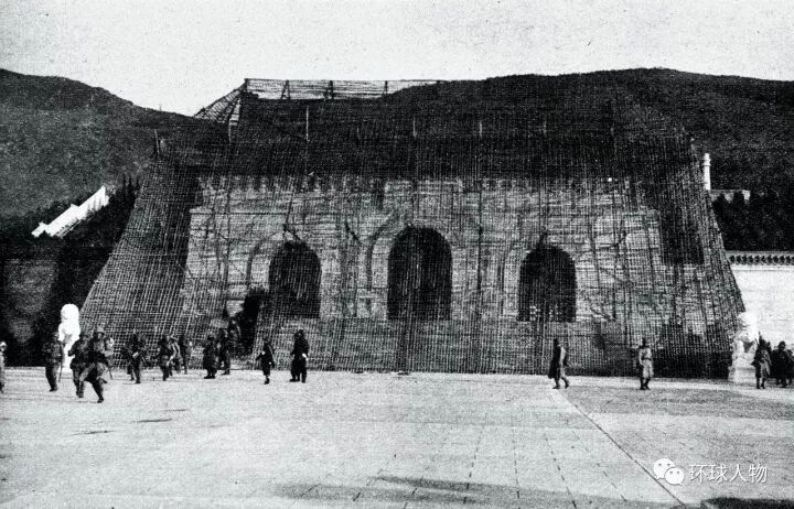 1937年12月17日,日本士兵在南京中山陵前游荡,此前中国守军为中山陵装置的伪装网仍然存在。