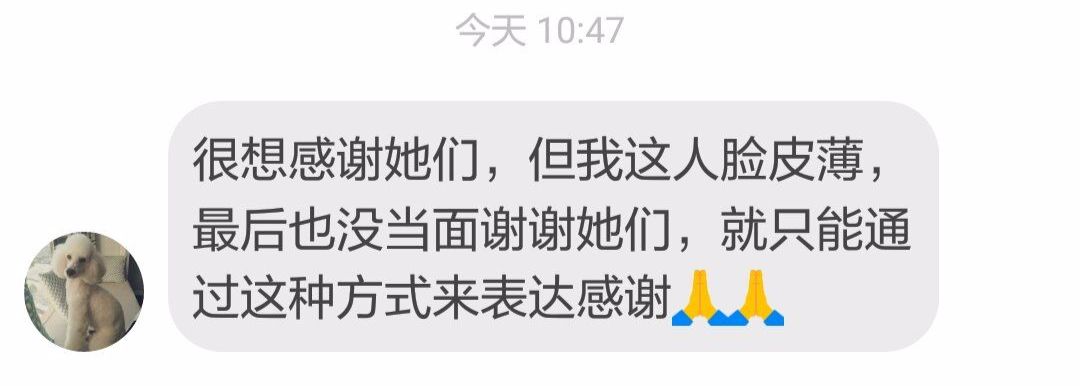 很想感谢她们,但我这人脸皮薄,最后也没当面谢谢她们,就只能通过这种方式来表达感谢。