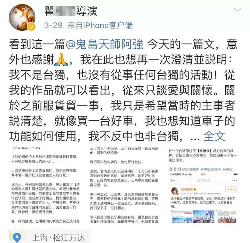 环环(ID:huanqiu-com)29日曾作题为☞台湾导演急了:我不是“台独”!原来他的新剧今晚就在大陆播!的报道,讲述了台湾导演瞿友宁的新剧在大陆视频网站播出,他却被怀疑支持“台独”一事。 ⬇️