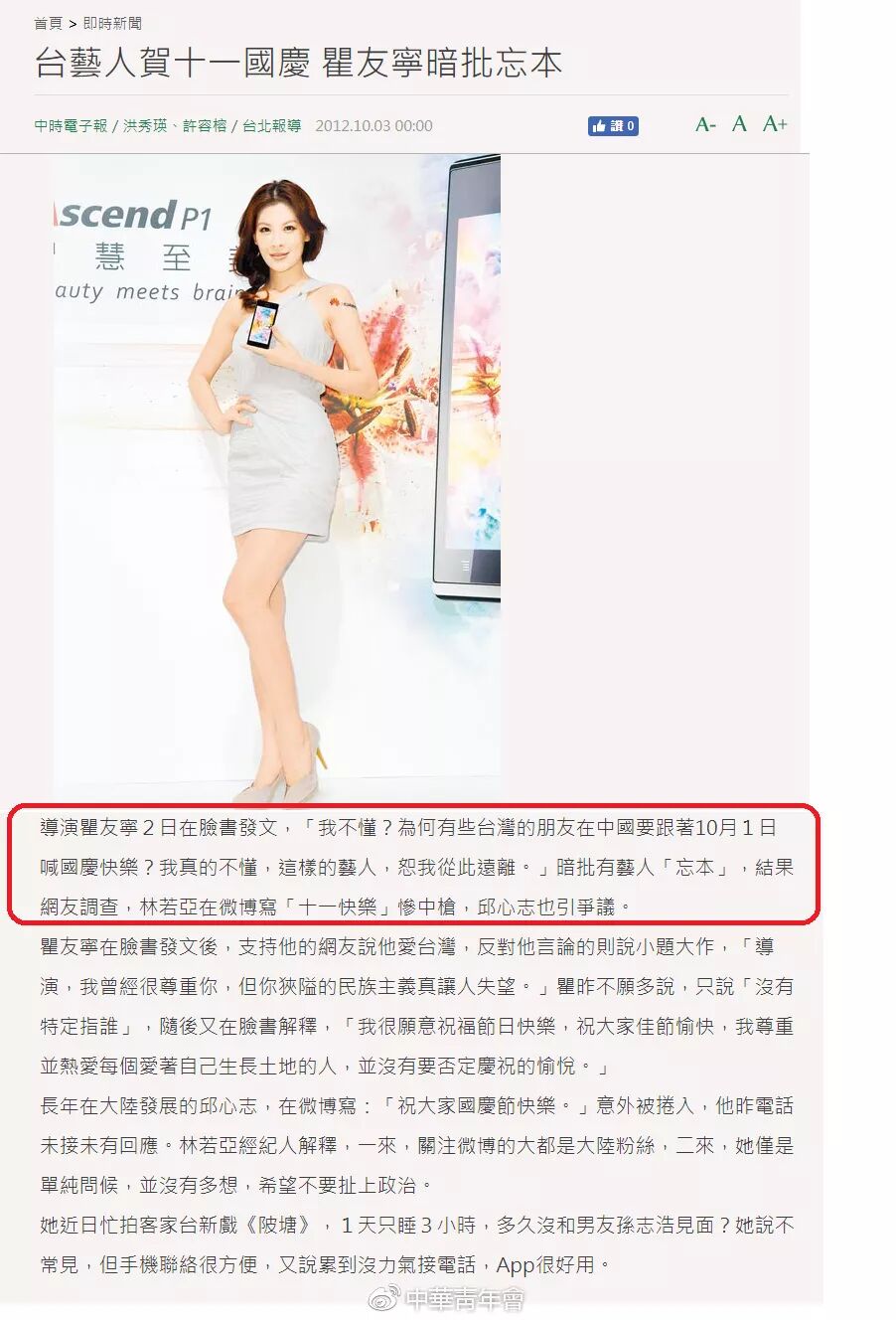 至于被网友指出曾批评其他艺人喊“十一快乐”,瞿友宁表示:“其实后来我有发过说明,我并非觉得十一国庆庆祝有何不妥,我只是看不惯言语立场始终两面的人同时也在庆祝台湾‘双十节’,而且我其实没有指出特定人士,却被台湾媒体硬是提出一些艺人对号入座,我也非常无奈。”