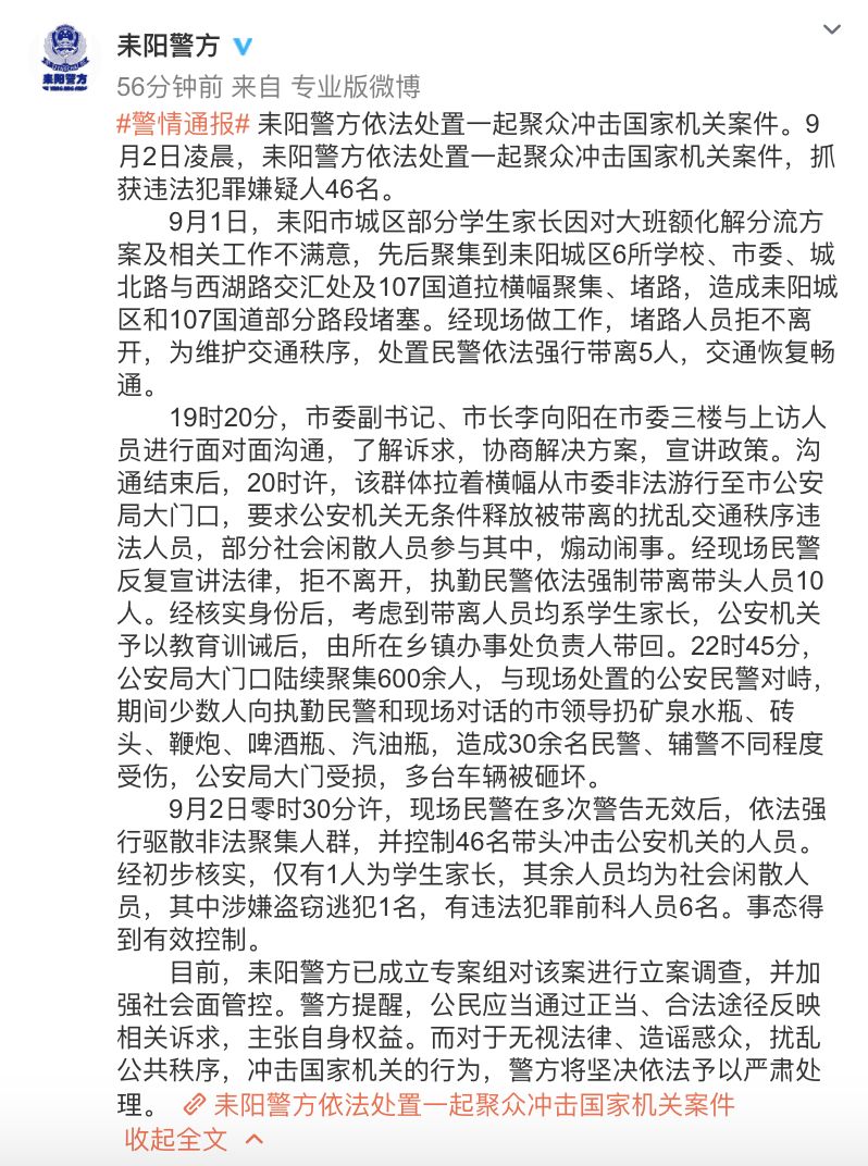 据@耒阳警方 耒阳警方依法处置一起聚众冲击国家机关案件。9月2日凌晨,耒阳警方依法处置一起聚众冲击国家机关案件,抓获违法犯罪嫌疑人46名。