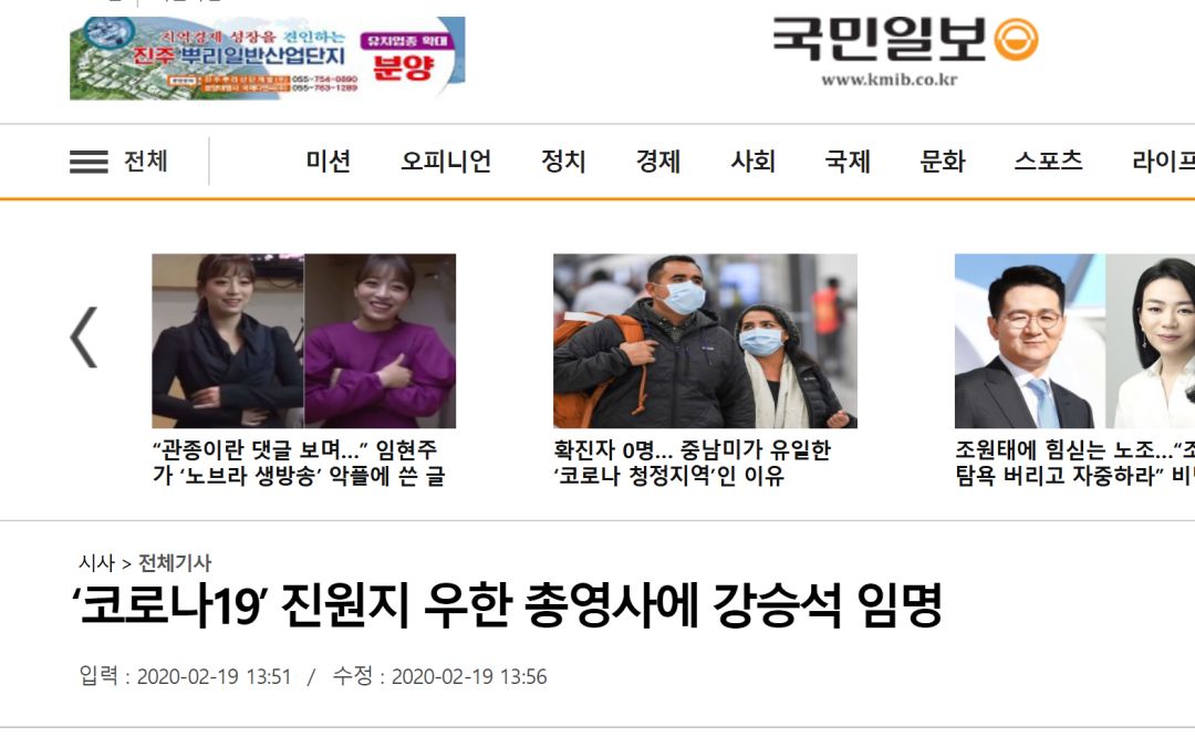 《国民日报》:(韩国政府)任命姜承锡为驻武汉总领事
