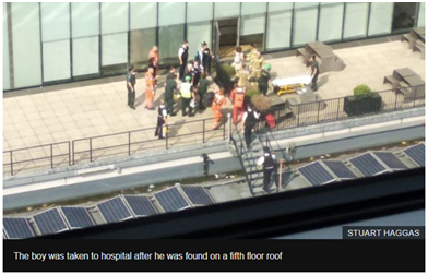 受伤男孩在5楼处被发现,并被送往医院。