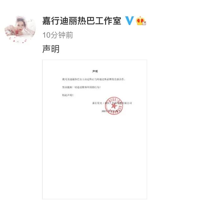 3月25日下午,杨幂、迪丽热巴、邓伦、王嘉尔、陈立农、易烊千玺、彭于晏、Angelababy(杨颖)、陈奕迅、向佐方面发布声明,宣布终止与阿迪达斯的一切合作。杨幂、迪丽热巴工作室声明均写道,“坚决抵制一切造谣欺侮中国的行为!”易烊千玺工作室在声明中写道:“易烊千玺先生及其工作室坚决抵制任何污名化中国的行为。”